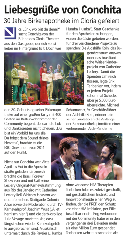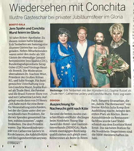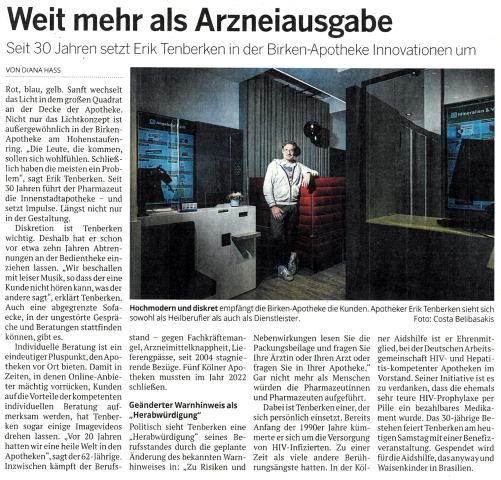 Die Kölnische Rundschau berichtet in Ihrer Ausgabe vom 15.04.2023 über den 30. Geburtstag der Birken-Apotheke und am 16.04.2023 über die Jubiläumsfeier im Gloria: